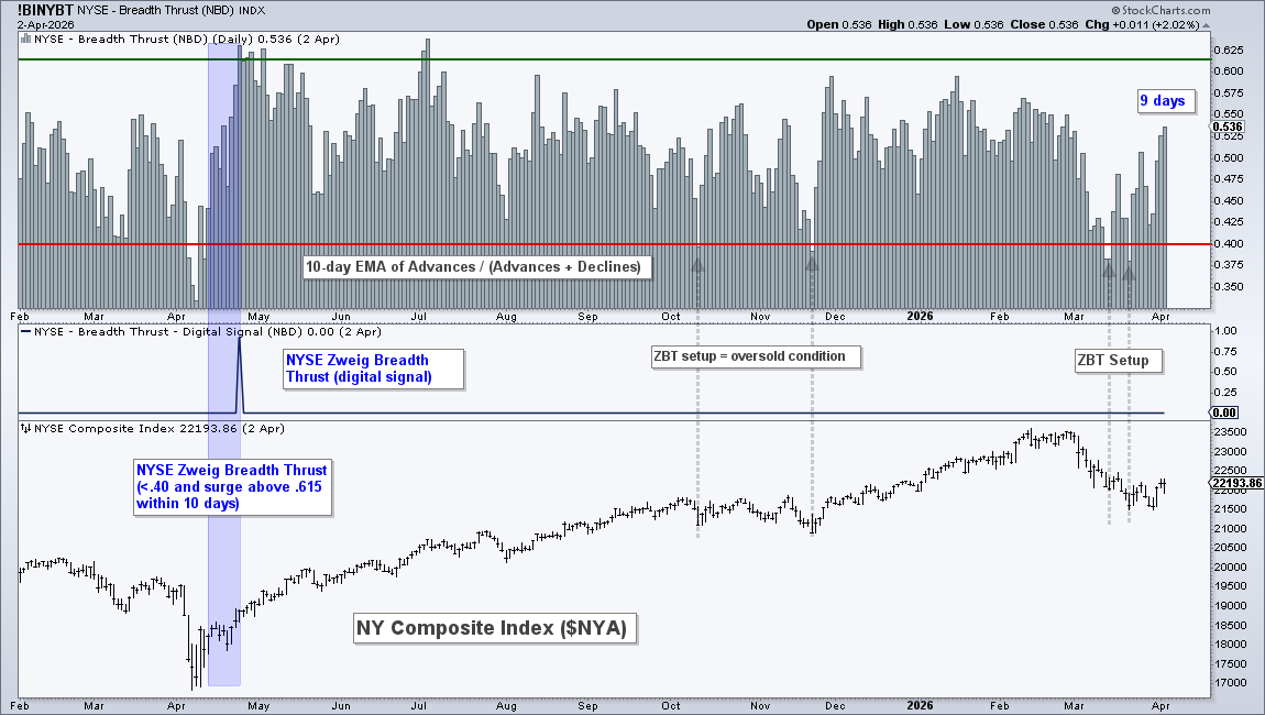 The Zweig Breadth Thrust is setting up with an oversold reading on March 20th. Stocks firmed after this reading and have one day to produce a classic Zweig Breadth Thrust (ZBT). Note that the Zweig Breadth Thrust is best known for its bullish signals. Traders can also use the “setup” period to identify oversold conditions. Today’s report will explain the indicator, show the setup and set the thrust signal requirements.
