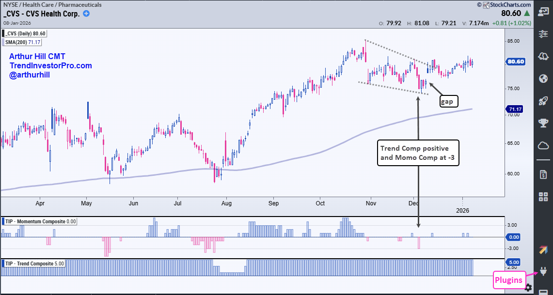 The next chart shows CVS Health (CVS) with the Trend Composite positive (uptrend) and the Momentum Composite becoming oversold on December 2nd (-3). A falling wedge formed and the stock broke the wedge line with a gap surge on December 9th. The wedge looks like a correction within the long-term uptrend. The gap-breakout signals an end to this correction and a resumption of the uptrend.