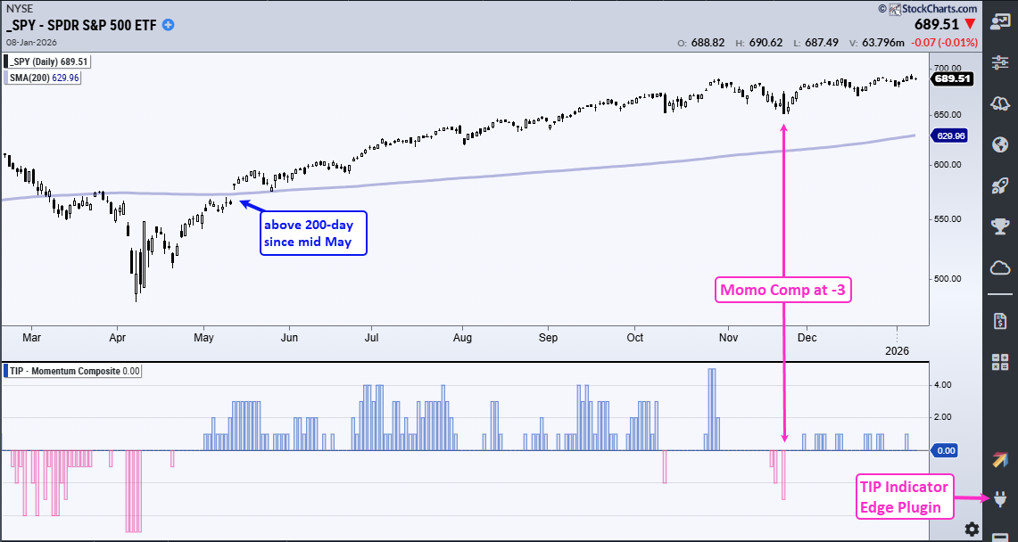The indicator window shows the Momentum Composite, which aggregates overbought and oversold signals in five momentum indicators. Readings at -3 or lower signal conditions. It hit -3 in late November for the first oversold reading since the uptrend began. This means three of the five indicators were oversold. The Momentum Composite is one of 11 indicators in the TIP indicator edge plugin for StockCharts ACP.