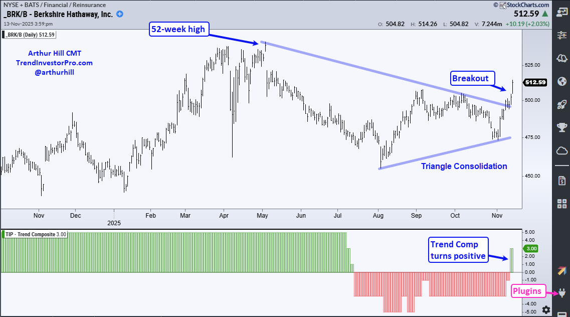 Trend-following indicators lag, which means they will never catch a top or bottom. These indicators signal when a move is strong enough to reverse the prior trend. Not all signals work, but some lead to extended trends that more-than-pay for the poor signals. For Berkshire, the Trend Composite turned positive in mid November 2022 and stayed positive until mid July 2025, which price rising from 310 to 470.