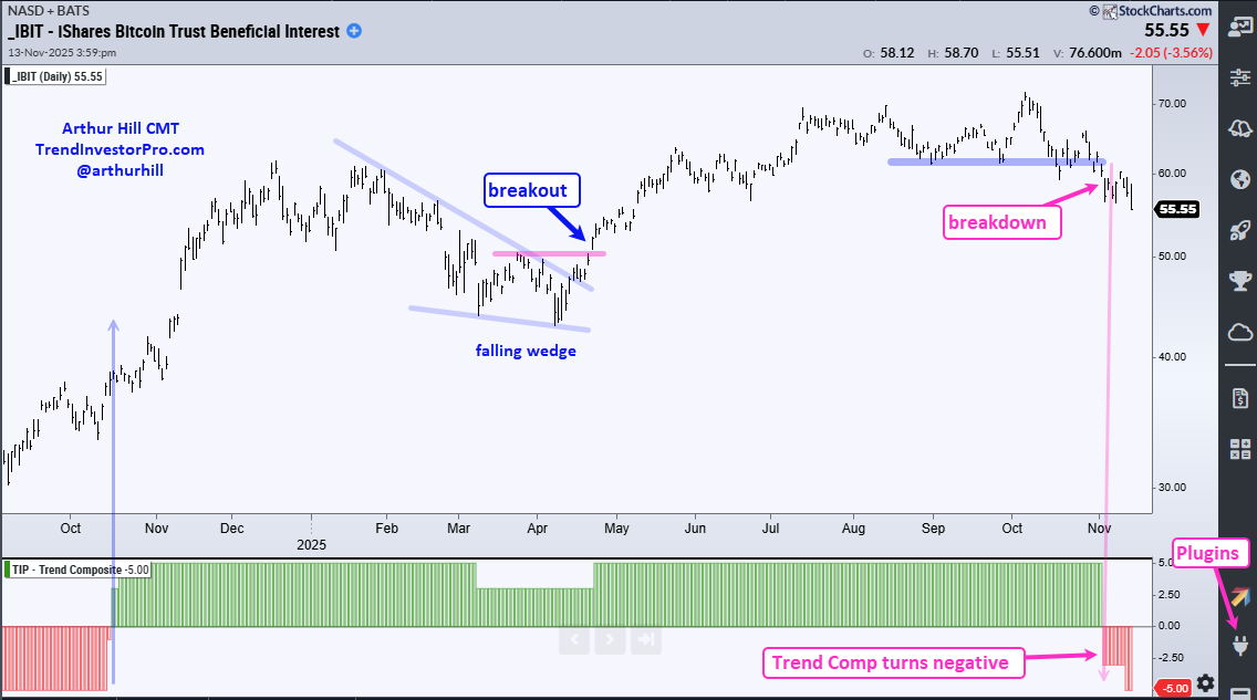 The next chart shows the Bitcoin ETF (IBIT) with the Trend Composite turning negative on November 4th. This downtrend signal reverses a bullish signal from mid October 2024. IBIT gained around 45% from mid October 2024 to early November 2025.