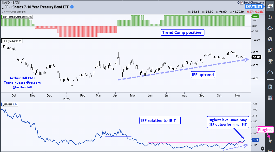 The 7-10Yr TBond ETF (IEF) is not the most exciting trade out there, but this bond ETF is in an uptrend and outperforming the Bitcoin ETF. The chart below shows the Trend Composite turning positive in early April and IEF trending higher the last six plus months. In the lower window, we have the price-relative (IEF/IBIT ratio), which measures relative performance. IEF underperformed IBIT from April to early October as the price-relative fell. This relative performance line turned up in October and recorded a five month high in early November. This means Treasury bonds (safe-haven assets) are outperforming Bitcoin (risk asset). Trade accordingly!