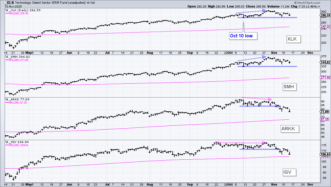 Cracks are appearing in the tech sector as the ARK Innovation ETF (ARKK) and Software ETF (IGV) break their lows from October 10th. Stocks fell sharply on October 10th with the Technology SPDR (XLK) losing 4%. XLK then rebounded into late October with a new high on October 29th (blue arrows). The Semiconductor ETF (SMH) followed suit with a new high as well. As the chart below shows, both XLK and SMH are still above their October 10th lows (as of Thursday’s close).