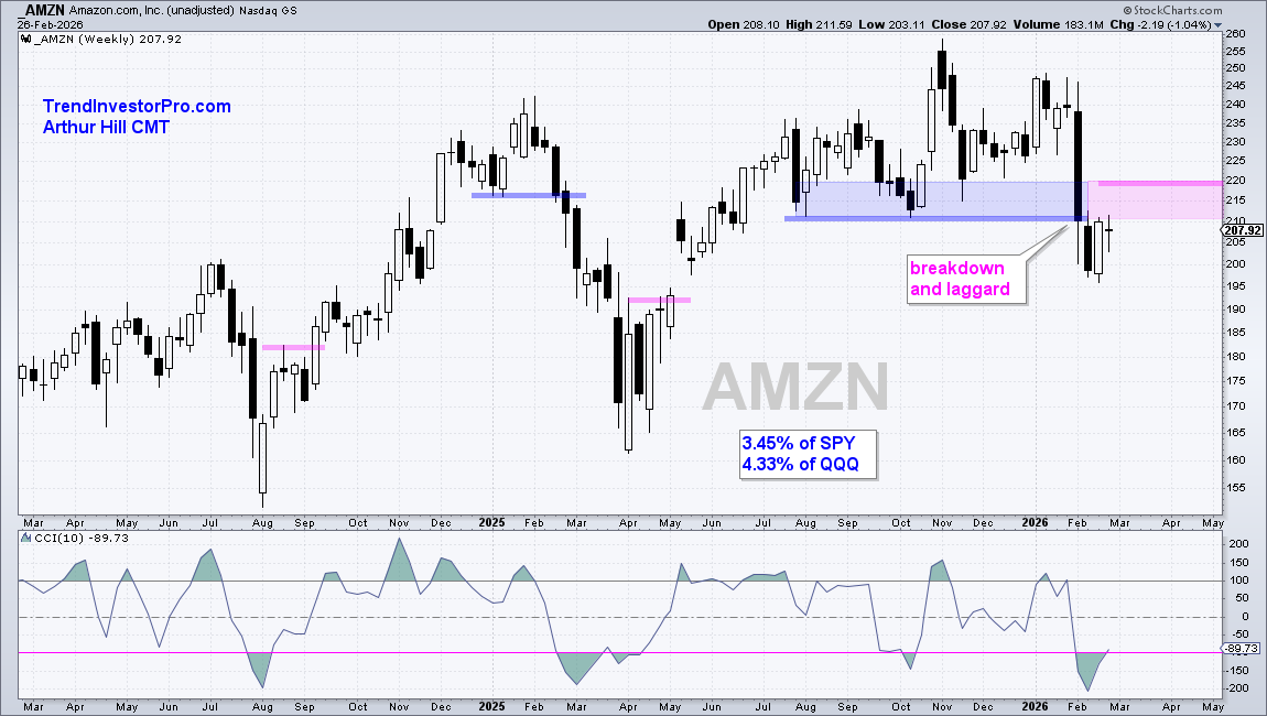 Mag 7 stocks powered the market higher from April to October, but sputtered since November with three breaking down on the price charts. Four of the seven, however, are still in long-term uptrends. Today’s report will start with the three laggards and then turn to Apple, which is a leader. Note that we cover Alphabet, Nvidia and Tesla in a separate report for subscribers.