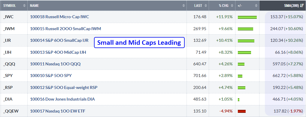 The summary table below shows performance for SPY, QQQ and seven other major index ETFs. This table is sorted by the SMA(200) column, which shows the percentage above the 200-day SMA. The Russell Microcap ETF (IWC) is leading because it is 11.91% above its 200-day. Small-caps are are next with the Russell 2000 ETF (IWM) and S&P SmallCap 600 SPDR (IJR) over 10% above their 200-day SMAs. SPY and QQQ, in contrast, are less than 5% above their 200-day SMAs.