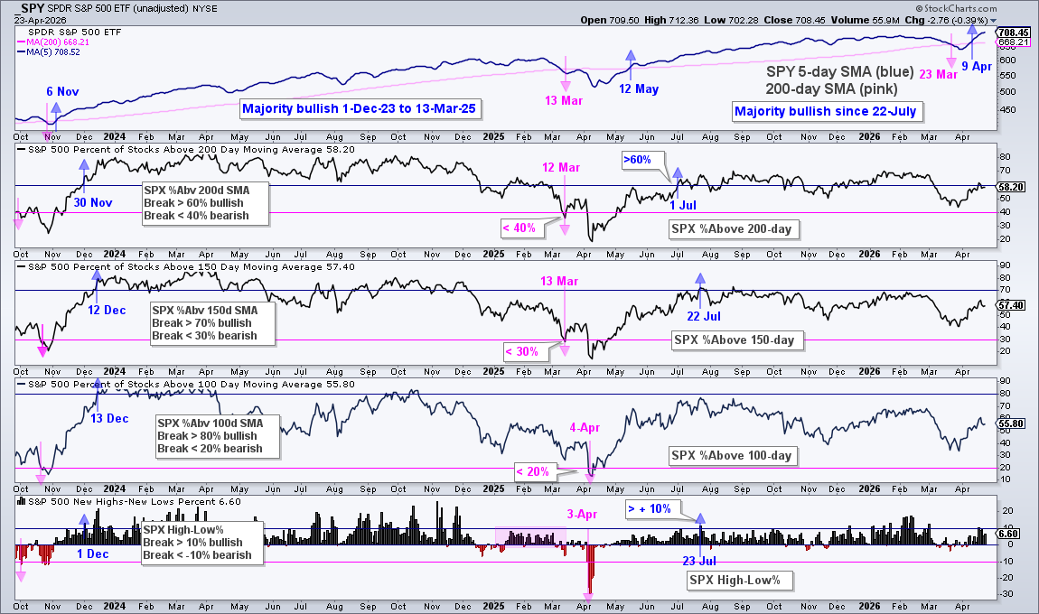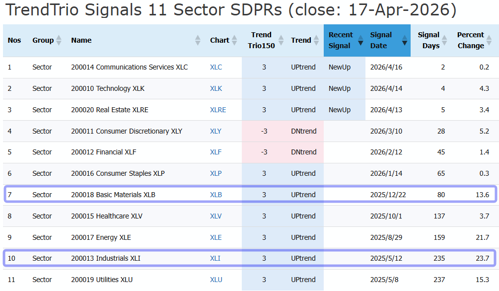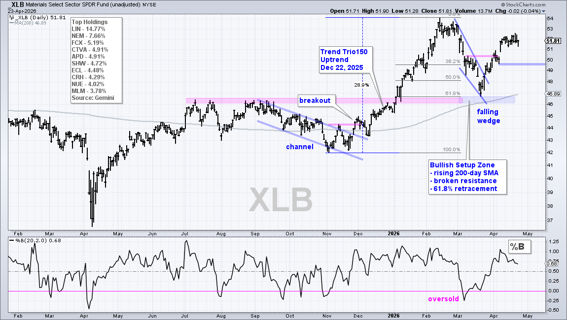 Our key trend indicator, the Trend Trio150, remained bullish throughout March for XLI and XLB. The table below shows Trend Trio150 signals for the 11 sector SPDRs. XLI and XLB signaled uptrends in May 2025 and December 2025, respectively (blue outlines). This signal table is free and updated every Saturday at TrendInvestorPro.